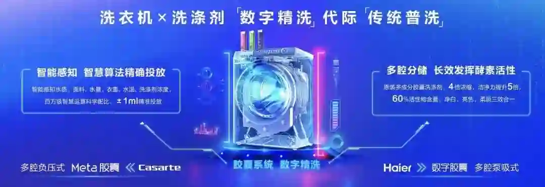 在此基础上,海尔全新推出的胶囊洗衣机,通过机身三腔分储,避免普通洗衣液活性低的问题。洗衣机内搭载数字胶囊系统,智慧算法能智能感知水质、面料、衣重、水量、水温、浓度,配合AI大数据运算,提供最佳配给量,做到洗涤剂的智慧配给、精准投放。海尔添彩胶囊洗衣机以场景生态新模式,一键就能满足洗净、护色、柔顺3种需求。使得洗护衣物告别了传统普通洗涤,进入了数字精洗时代。