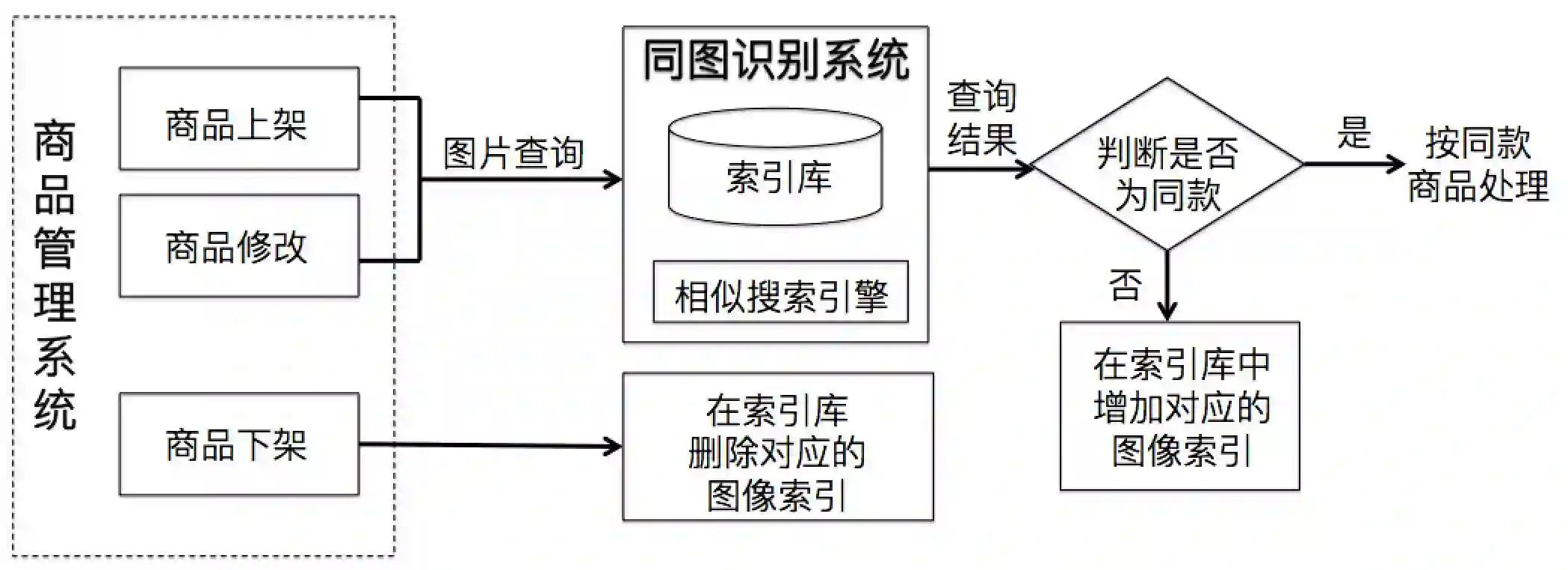 电商基础业务中,需要审核商家上传的商品图片。我们在实践中基于相似图像搜索技术,构建了同图识别系统。系统产出了全量图像数据的索引库,基于相似搜索引擎来查询商家图片是否为商品库中的相同图像。根据查询结果,结合业务规则,判断商品是否为同款。图 3 给出了同款商品识别的系统概要图。