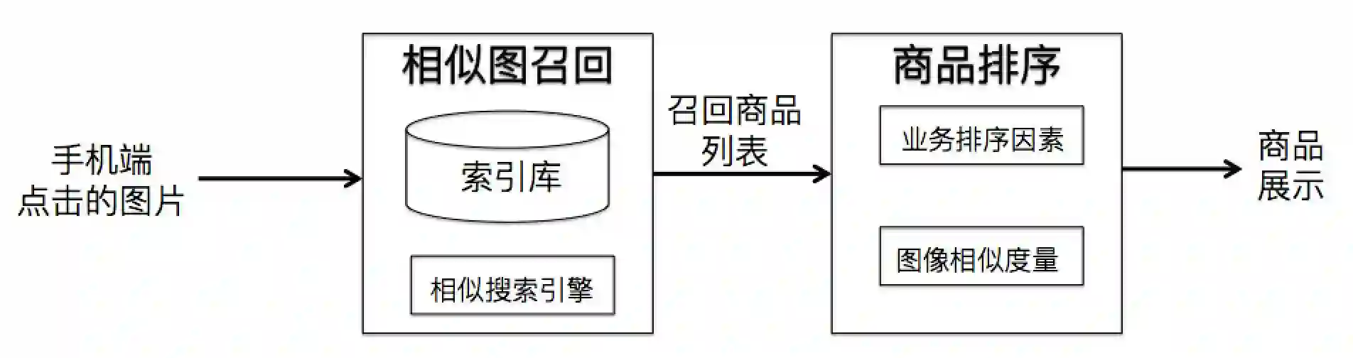 图 5 展示了系统概要图。在实现过程中,采用了图像搜索技术来承担相似图像查询,从而召回相似商品列表,然后结合业务因素和图像相似性,进行商品排序。通过该功能,能够提升用户在蘑菇街 APP 上的浏览体验,有利于发现更多相似商品;同时,用户的停留时长也有所增加。