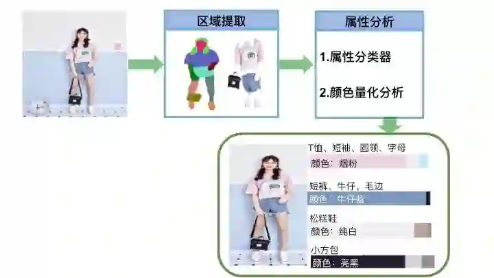这个阶段利用图像分割技术,将商品主体从背景中分离出来。以服装图像为例,区域提取的目标是对图片进行精细化语义分割,排除背景与服装、服装与服装之间的相互干扰。针对服装模特图片,我们通过 Human Parsing 算法,把主要区域提取出来,例如:头肩、上衣、裤子、鞋、包包等。