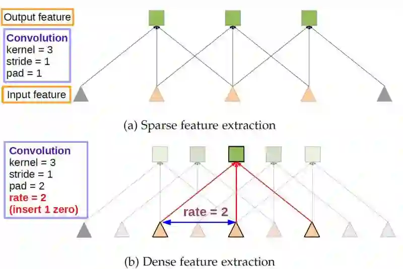 丢失的位置结构信息主要由于重复池化和下采样造成,因此我们的网络中移除了最后的若干个最大池化层下采样操作,并对滤波器进行上采样,在非零的滤波器值之间加入空洞,进行空洞卷积。如图 7 所示,(a) 中的常规卷积只能获取到较小感受野上的稀疏特征;(b) 中方法采用空洞卷积后可以得到较大感受野对应的更丰富特征,对应到服装语义分割也就保留了人体和服装之间的位置结构信息,有助于服装分割效果的提升。