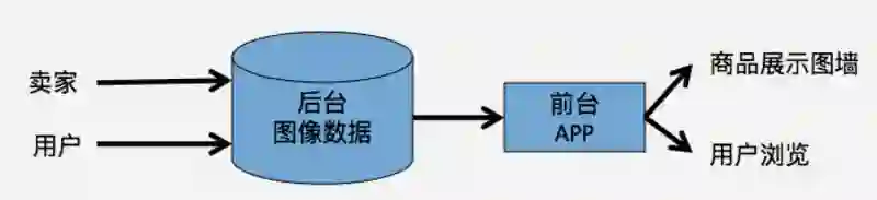 如同 1 所示,在电商平台中可以按照业务流向简单地描述图像数据。电商平台从商家或者用户处,获取到不同来源的图像数据,并且存放于后台图像数据库;前台 APP 产品作为面向用户的界面,基于图像数据和业务算法,把商品呈现在用户眼前,主要包括商品展示图墙页面和用户浏览页面。