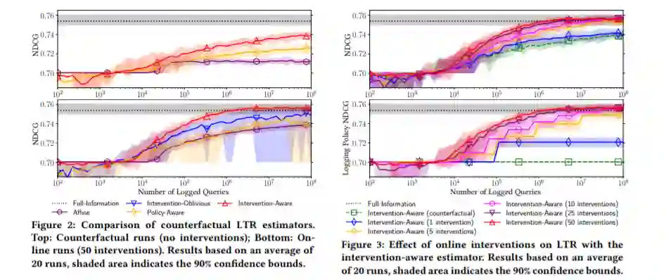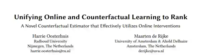 基于用户交互来优化排名系统是一个被广泛研究的问题。基于用户交互的优化排名系统的最先进方法分为在线方法(通过直接与用户交互进行学习)和反事实方法(通过历史交互进行学习)。现有的在线方法在没有在线干预的情况下会受到阻碍,因此不应该被用到反事实方法中。相反,反事实的方法不能直接从在线干预中获益。我们提出了一种新的干预感知估计器,用于反事实和在线学习排序(LTR)。随着干预感知估计器的引入,我们的目标是连接在线/反事实LTR部门,因为它在在线和反事实场景中都被证明是非常有效的。通过使用基于日志策略行为和在线干预(在收集点击数据期间对日志策略所做的更改)的校正,估计器可以校正位置偏差、信任偏差和项目选择偏差的影响。我们的实验结果,在一个半合成的实验设置中进行,结果表明,不像现有的反事实LTR方法,干预感知估计器可以从在线干预大大获益。