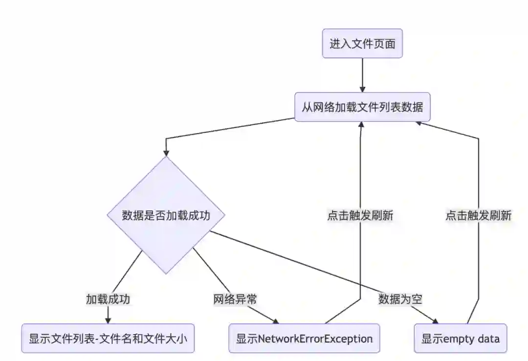 可以看到进入页面时,是从网络加载文件列表的。刚刚的图里面我们只看到了正常文件列表的显示,但这个流程图里面有很多异常条件。
