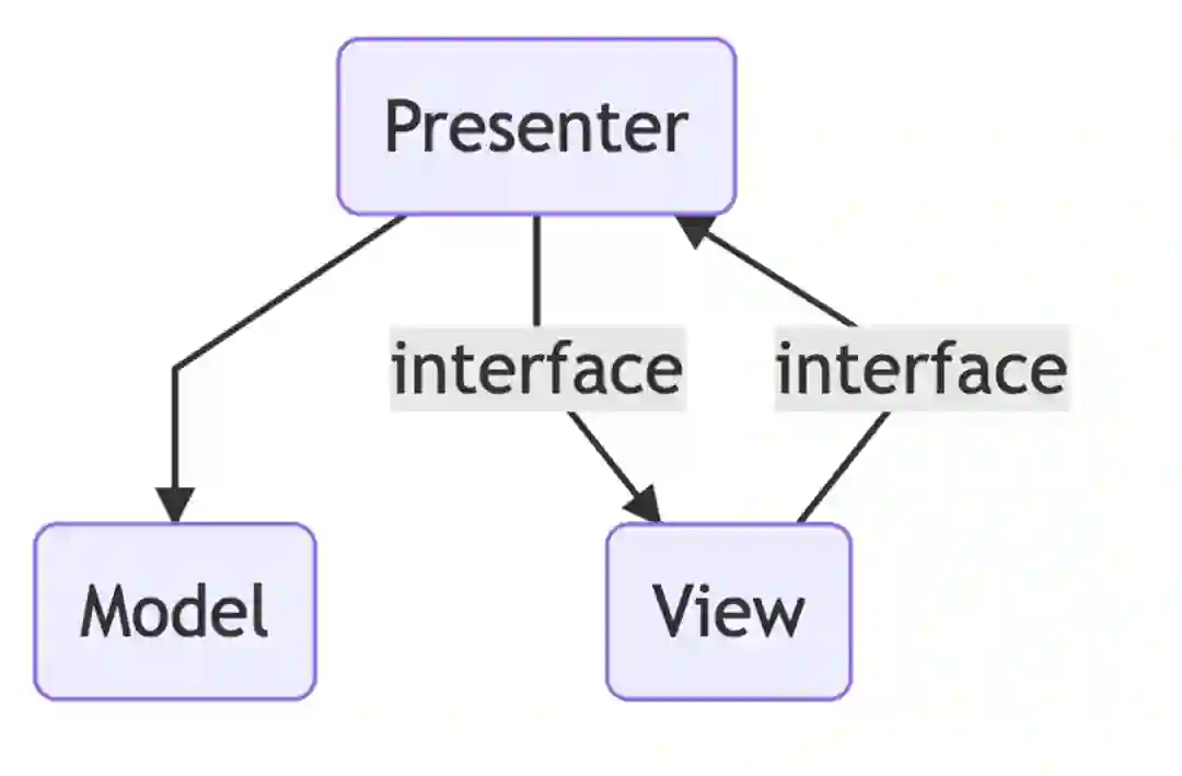 MVC第二种是 MVP 模式,MVP 模式跟 MVC 模式的主要的区别是 MVP 模式中 View 跟 Model 没有直接交互,它们是通过中间的Presenter以及一些接口的设计来达到双边的交互。
