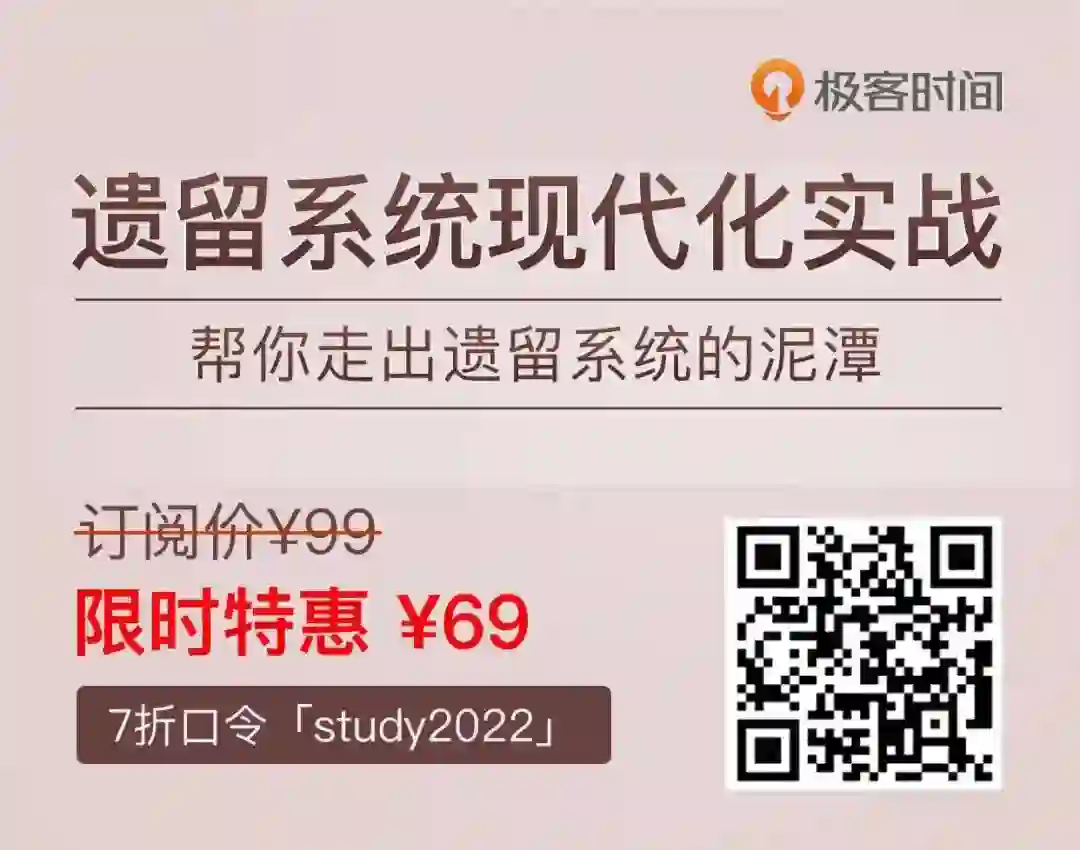 遗留系统一直是技术领域的“重灾区”,想要深入剖析遗留系统的特点和问题,推荐你学习这门专栏,它将从代码、架构、DevOps 和团队现代化四大方向,解决遗留系统治理的疑难杂症,帮你和所在团队走出遗留系统的泥潭。使用口令现仅 7 折入手,等你来品鉴!