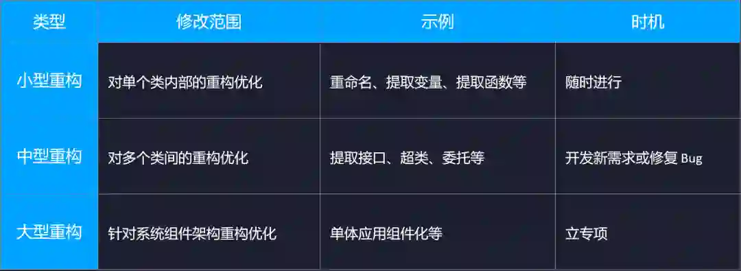 首先第一个问题,没有时间进行重构。其实我们更应该把重构按不同的修改范围去分类,在这里我们将重构分为了三种类型:小型重构、中型重构和大型重构。