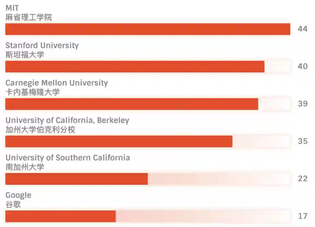 3 MIT是顶尖计算机科学家最多的研究机构,共有44名科学家入选,今年是他们首次超越斯坦福大学跃居榜首。