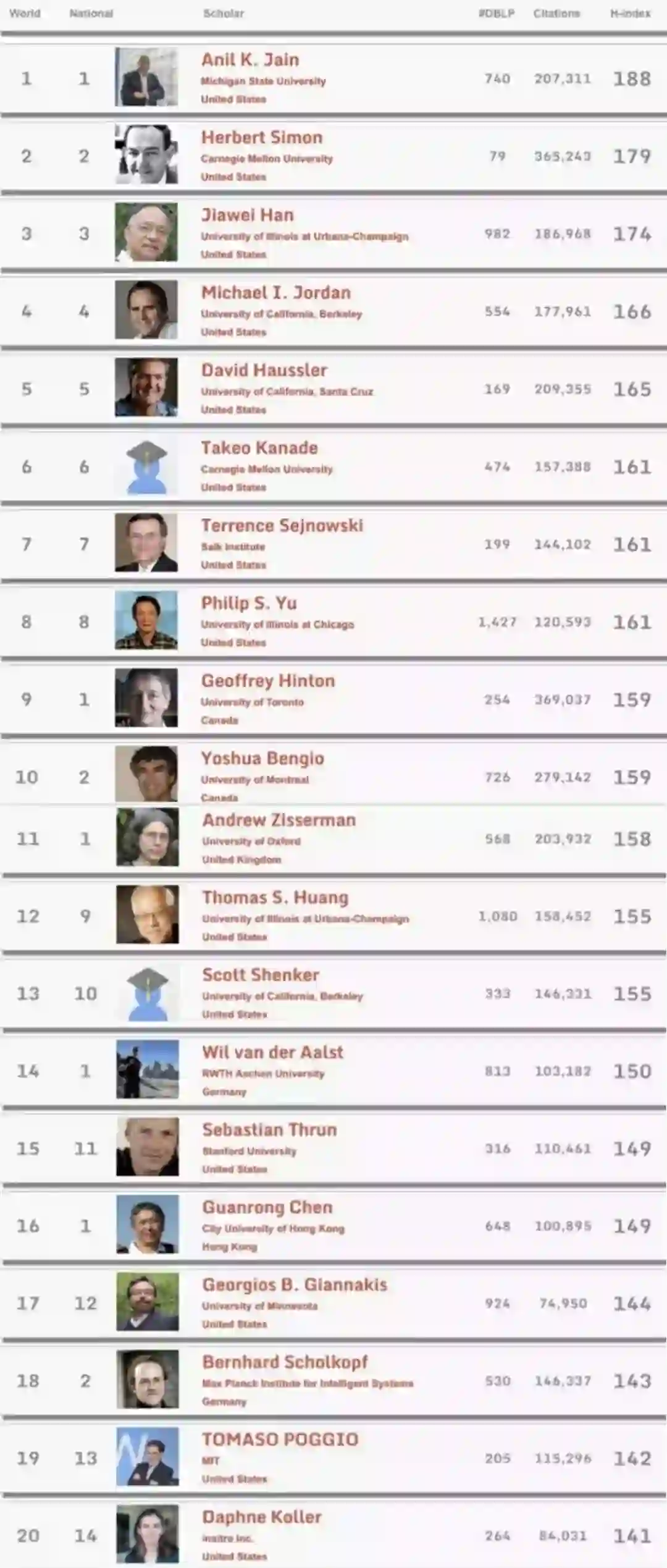 世界前20:AI大咖云集,72岁印度籍教授连续三年高居榜首