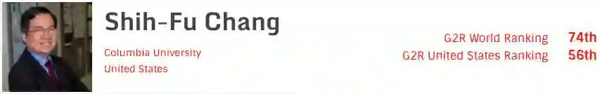 8、Shih-Fu Chang(张世富)教授,是台湾的计算机科学家和电气工程师,以其在多媒体信息检索,计算机视觉,机器学习和信号处理方面的研究而闻名。他目前是哥伦比亚大学工程与应用科学学院的高级执行副院长。2016年,他被Aminer评为多媒体领域最有影响力的学者,2017 年当选为ACM会士。