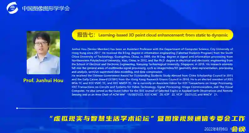 来自香港城市大学的侯军辉教授作《Learning-based 3D point cloud enhancement: from static to dynamic》的学术报告。该报告报道了近年来基于深度学习的点云质量增强、点云重建、稀疏点云上采样以及点云时域上采样等方面的工作。