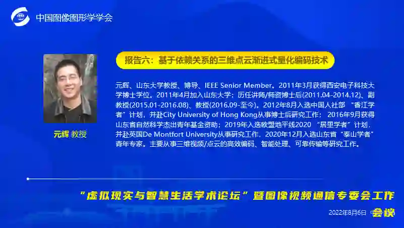 来自山东大学的元辉教授作《基于依赖关系的三维点云渐进式量化编码技术》的学术报告。报告指出,随着自动驾驶、沉浸式通信等技术的快速发展,基于三维点云的物体和场景的数字化表示受到越来越广泛的关注。但是三维点云巨大的数据量严重限制了相关技术的发展。目前 MPEG 正在制定三维点云编码标准,并提出了基于几何的点云压缩标准(G-PCC)和基于视频的点云压缩标准(V-PCC)。