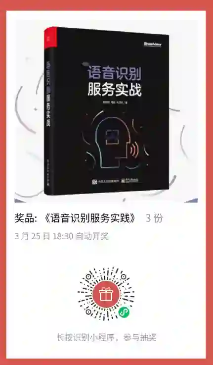 AI 前线为粉丝准备了《语音识别服务实践》纸质书籍 3 本!长按识别下图小程序,参与抽奖活动,由小程序随机抽出 3 位,每人赠送一本书。开奖时间:3 月 25 日(下周五) 18:30,获奖者每人获得一本。