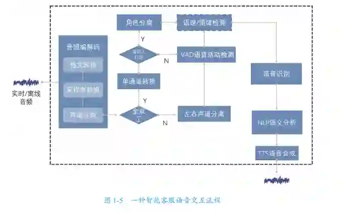 语音质检普遍被应用在智能外呼和客服领域。通过语音识别与声纹识别的相关技术,不仅可以对客户说话的内容进行语音语义分析,挖掘客户潜在需求,进行用户画像,提供个性化的客户服务与产品的精准营销,还可以对对话内容的合规性进行稽核与审查,进一步提升服务满意度。一个完整的智能客服语音交互流程,如图 1-5 所示。