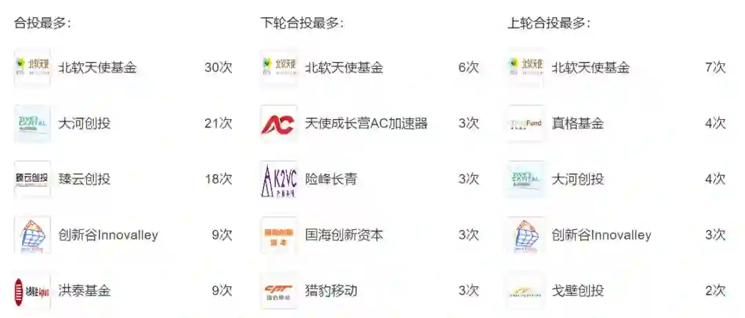 上轮合投方面,除了与英诺天使基金合作最为密切的北软天使基金之外,真格基金与英诺天使基金也有多合作,两者在上轮合投共计 4 次。