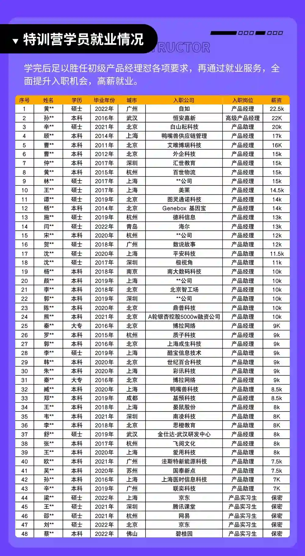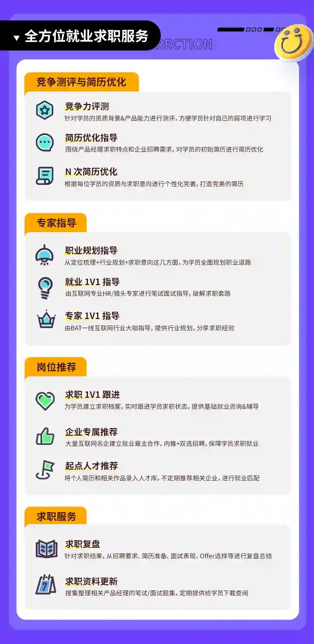 学习的最终目的是成为企业需要的产品人才,成功就业。业内其他产品课程,上完课就“戛然而止”了,导致很多学员依旧不懂互联网公司对产品经理有何要求,如何针对性优化简历,如何寻找适合自己的岗位机会,如何在面试中充分展现自己的产品能力,如何进行合理的薪资谈判……