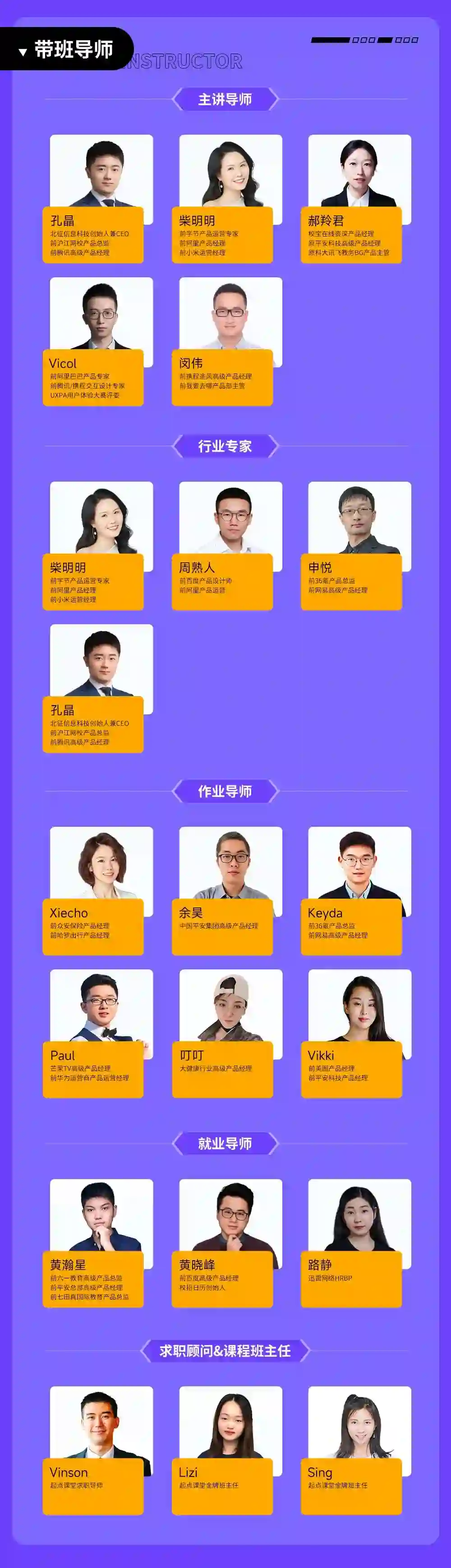 这门课,配备主讲导师、作业导师、就业导师、行业专家、班主任、助教6个重要角色,为你们带来比其他课程更多、更优质的教学服务。