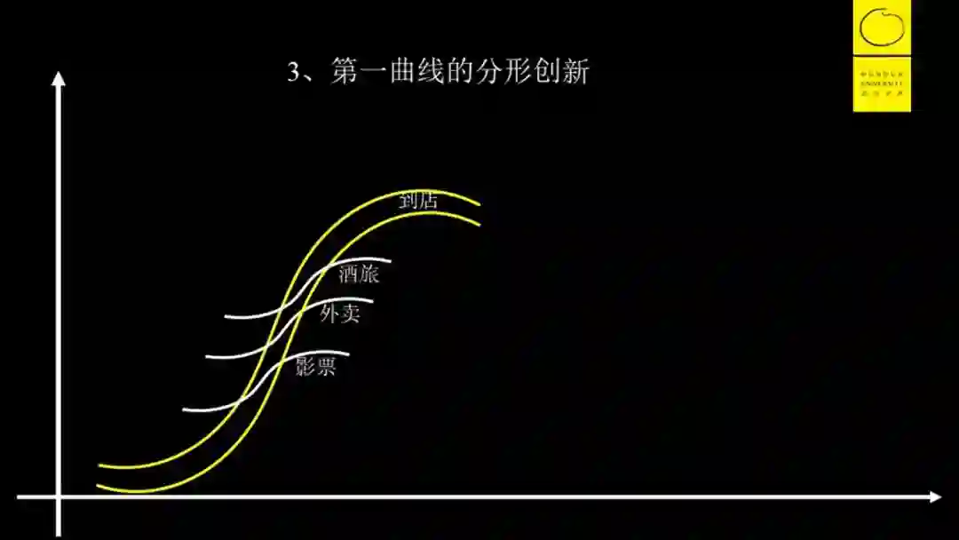 比如影票、外卖等分形,这一步内部称为钉耙理论或者一横多纵理论,做了很多的分形创新,其中外卖成长为独立的第二曲线,今天美团的第二曲线主营业务已经变成了外卖了。