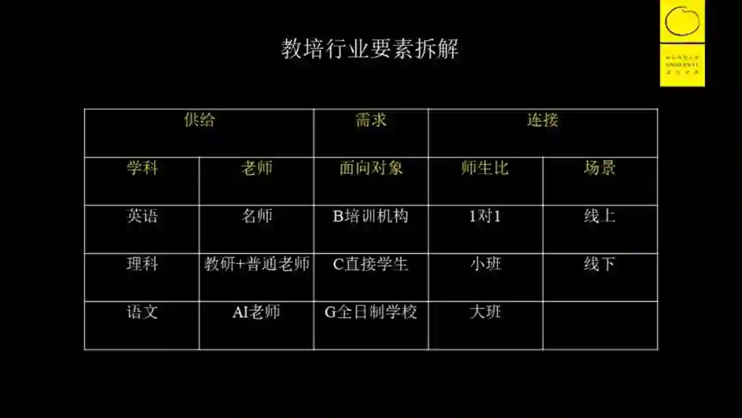 比如教培行业的组合式创新,要素组合有什么呢?供给端有学科,包括英语、语文等,老师有名师、教研、普通老师、AI老师。
