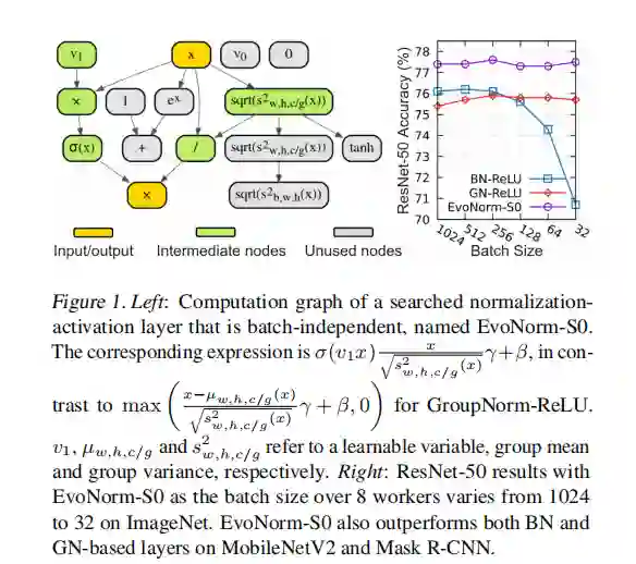 归一化层和激活函数是深度神经网络中经常采用的关键组件。除了将它们分开设计之外,我们将它们统一为一个计算图,并从低级开始发展其结构。我们的层搜索算法EvoNorms发现,EvoNorms是超越现有设计模式的一组新的进化激活层。这些层中的几个层具有独立于批量处理统计信息的属性。我们的实验表明,EvoNorms不仅在包括ResNets,MobileNets和EfficientNets在内的各种图像分类模型上表现出色,而且还可以很好地转移到Mask R-CNN进行实例分割和BigGAN进行图像合成,从而大大优于基于BatchNorm和GroupNorm的图层。