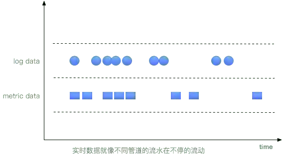 在实际的系统运行过程中,随着时间的推移,日志数据以及监控数据是源源不断的在产生的。每条产生的数据都有一个自己的时间戳。而实时传输这些带有时间戳的数据就像水在不同的管道中流动一样。