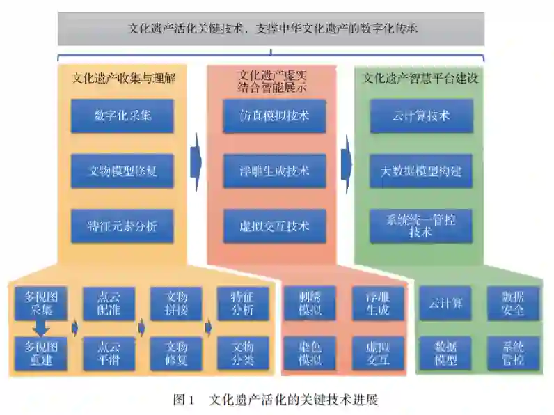 该文基于先进的智能计算、数字媒体、虚拟现实/增强现实技术,结合文化遗产的传播过程和艺术特点,分析和综述了文化遗产收集理解、虚实结合智能展示交互、智慧化平台建设等活化关键技术发展现状、前沿动态、热点问题和发展趋势。