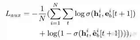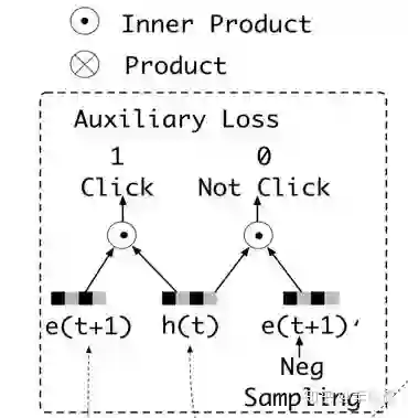 其中a为超参数,代表的是辅助loss对整体loss的贡献。有了这个辅助loss,t时刻提取的隐层向量h(t)可以比原始的h(t)更有助于表达用户兴趣,也可以加速网络的训练过程。