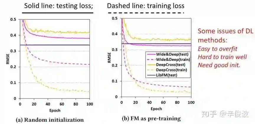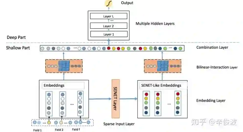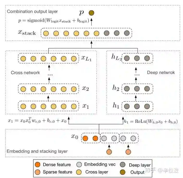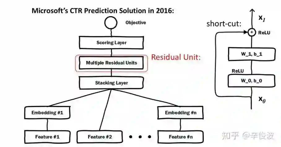 和wide&deep最大的不同是deep部分引用了res-net,但个人觉得在目前主流的模型里用的较少。虽然res-net理论上可以使用更深的模型提升效果,但在目前工业界大规模稀疏的推荐系统里,还没见到太多往res-net方向取得较大进展的工作。