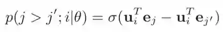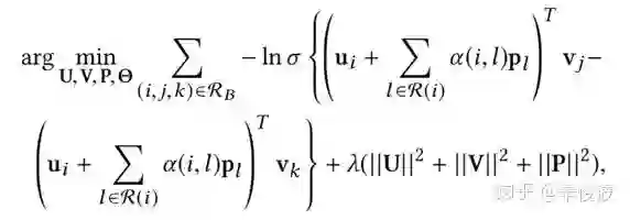 如上述公式所示,不直接拟合用户对item的单个打分,而是以pair的形式进行拟合;一般来说,用户打分高的item>用户打分低的item;用户用过交互的item>用户未交互过的item(不一定真的不喜欢)