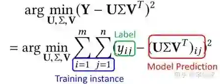 其中yij为用户i对物品j的真实评分,也就是label, U和V为模型预估值,求解矩阵U和V的过程就是最小化用户真实评分矩阵和预测矩阵误差的过程。