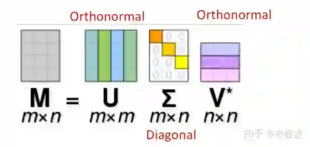 其中左侧M=m*n表示用户评分矩阵,m矩阵的行表示用户数,n矩阵的列表示item数,在大多数推荐系统中m和n规模都比较大,因此希望通过将M分解成右侧低秩的形式。一般来说SVD求解可以分为三步: