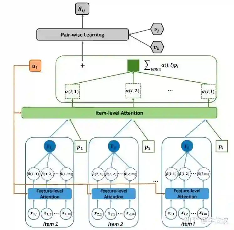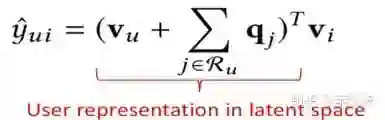 注意到用户表达不再是独立的隐向量,而是用用户喜欢过的所有item的累加求和得到作为user的表达;而item本身的隐向量vi是另一套表示,两者最终同样用向量内积表示。
