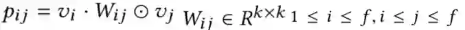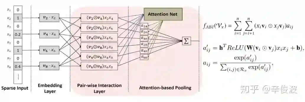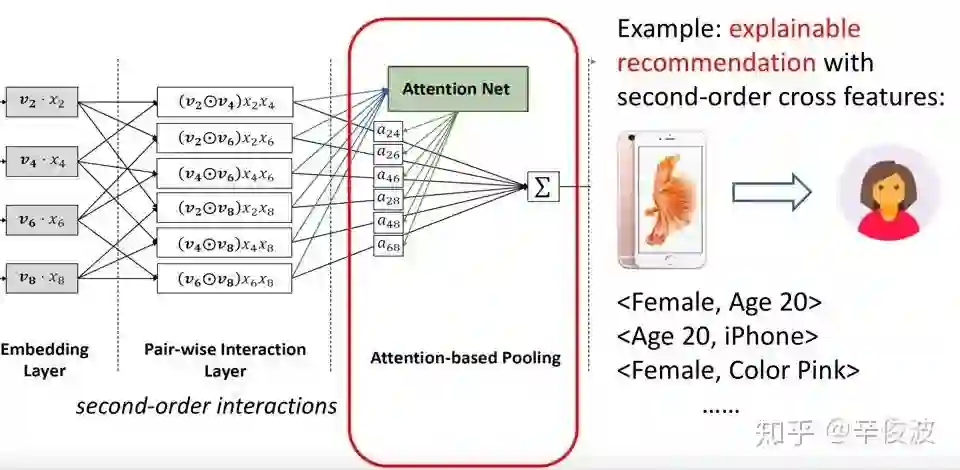 交叉使用的带权重的bi-interaction,可以理解成所有vector的weight sum pooling,然后使用一个简单的线性模型得到最终的值