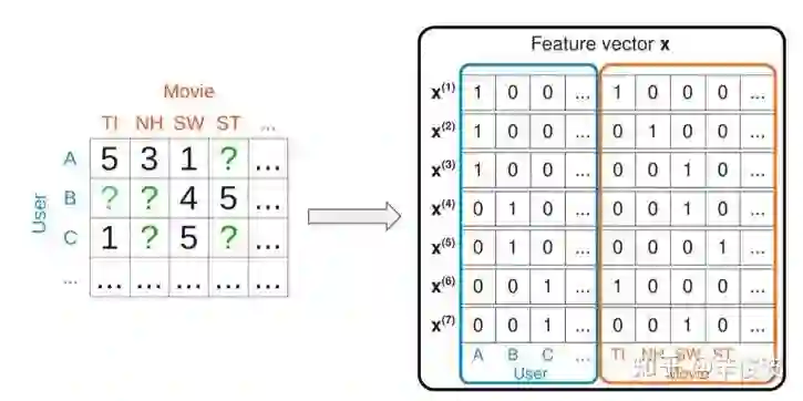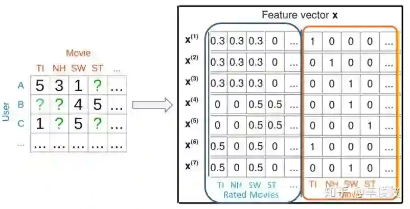 由两部分组组成,其中user由user交互过的item集合来表示,是个multi-hot的打分表示,如[0 0 4 0 0 … 1 5 …],在矩阵中用行表示;item也由交互过的user集合来表示,也是个multi-hot的表示,如[5 0 0 3 … 1 3],在矩阵中用列表示