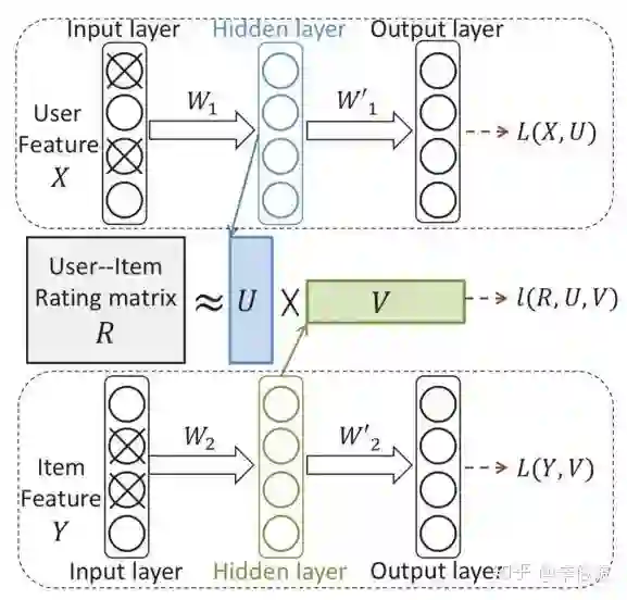 用ru表示用户向量,ri表示item向量,通过autoencoder将ru或者ri投射到低维向量空间(encode过程),然后再将其投射到正常空间(decode过程),利用autoencoder中目标值和输入值相近的特性,从而重建(reconstruct)出用户对于未交互过的item的打分。