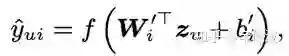 通过auto-encoder的结构表示,其中,h(r; theta)表示的是输入层到隐层的重建;由于输入的是用户交互过的item(multi-hot),所以在隐层中的蓝色节点表示的就是user representation;而输出的节点表示的是item的representation,这样就可以得到user和item各自representation,如下面公式所示