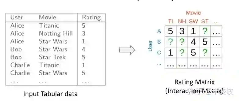 CF协同过滤的思路要解决的问题用数据形式表达就是:矩阵的未知部分如何填充问题(Matrix Completion)。如图2.1所示,已知的值是用户已经交互过的item,如何基于这些已知值填充矩阵剩下的未知值,也就是去预测用户没有交互过的item是矩阵填充要解决的问题。