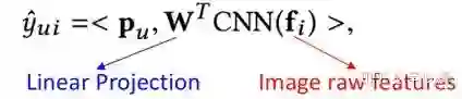 其中,每个用户表达分成两个部分,左边vu表示用户id映射的隐向量(user-based CF思想),右边是用户交互过的item集合的求和(item-based CF思想)。User和item的相似度还是用向量点击来表达。