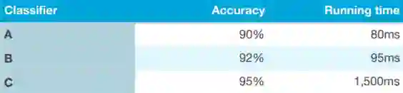 以上图所示为例,我们可以首先定义可接受的运行时间,比如小于 100 毫秒,这可以视为我们的“满意度”指标。你的分类器必须“足够好”,因为要求它的运行时间小于 100 毫秒这个值,仅此而已。此处的准确度(Accuracy)是“优化”指标。它可以是评估算法的一种非常有效、简单的方法。