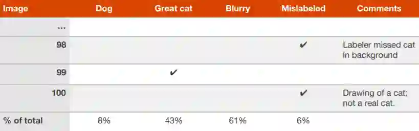 在这种表格中,包括对每张图片的分析,失败的原因,以及其他可能有助于未来反思的意见。完成之后,你可以看到哪些想法能够消除更多的错误,因此应该进行哪些操作。