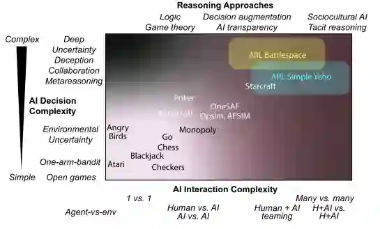 对于兵棋推演,有必要开发能够模拟包括战术和战略层面在内的多个梯队的决策测试平台。现有的兵棋推演决策工具,如Opsim、AFSIM和OneSAF,可以在多个规模上对许多因素进行建模和模拟,以预测基于战略、物资能力和资源的结果,但它们受到老化系统的限制,有经验的士兵可能难以学习,也不太适合开发人工智能和人类+人工智能编队协作的能力。最近,人工智能能力的快速上升为开发和纳入新型人工智能作为兵棋推演的决策辅助工具打开了研究的大门。最近人工智能推理的改进(例如,基于深度强化学习)是基于环境状态完全已知的“开放”游戏(例如,跳棋、国际象棋和围棋),它们是基于有限的合作性或欺骗性。即使在有额外复杂性的情况下,如环境的不确定性(愤怒的小鸟、雅达利),决策的复杂性、灵活性和对多人兵棋推演的可转移性也是有限的(如扑克、Minecraft、星际争霸[图1])。尽管这些模型可以深入探索决策,但它们只限于选择结果的潜在价值可以很容易测量和量化的条件。兵棋推演环境给人工智能学习带来了困难和未解决的挑战,因为有许多信息不确定性的来源,不仅来自环境,也来自人类和人工智能Agent。人工智能需要适应不断变化的规则和战略,迅速减轻出乎意料的敌方能力,并利用新的机会和友好的能力。人工智能还需要与他们的人类队友相互适应,他们需要有默契的推理能力来与人类专家协同工作,并补偿个人的偏见和启发式方法以及变化的认知状态。与博弈论等经典方法不同的是,未来状态的预期效用可以根据合作或不合作的选择对有限的行动集进行明确的量化,兵棋推演提出了跨环境和社会动态(包括合作性和欺骗性)以及跨多个时空尺度和领域的相互作用的可能性,这使人工智能学习决策如何与未来状态价值相联系的能力受到影响。