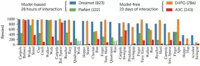 在给定原始图像输入的有20个连续控制任务的基准上,Dreamer无论在性能上,还是在数据效率和计算时间上,都达到了最佳水平。