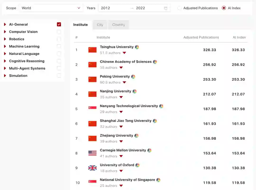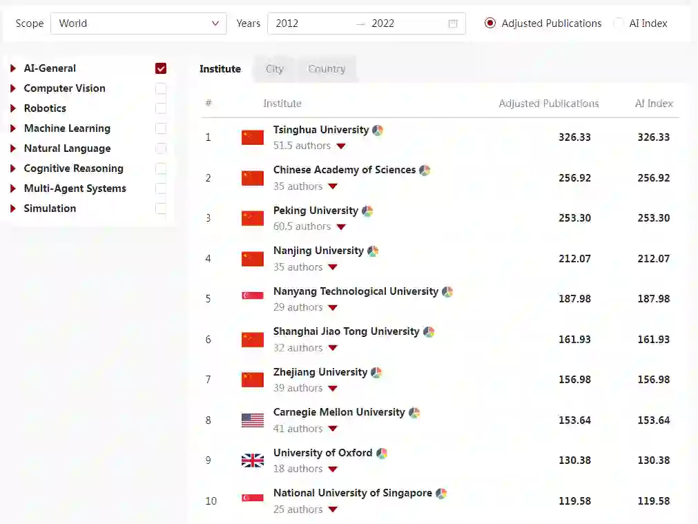 (AI-General)的排名中,单看出版物,全球排名前10的院校中,有6所来自中国,分别是:清华大学、中国科学院、北京大学、南京大学、上海交通大学与浙江大学: