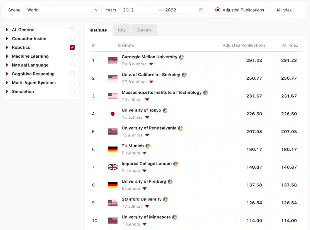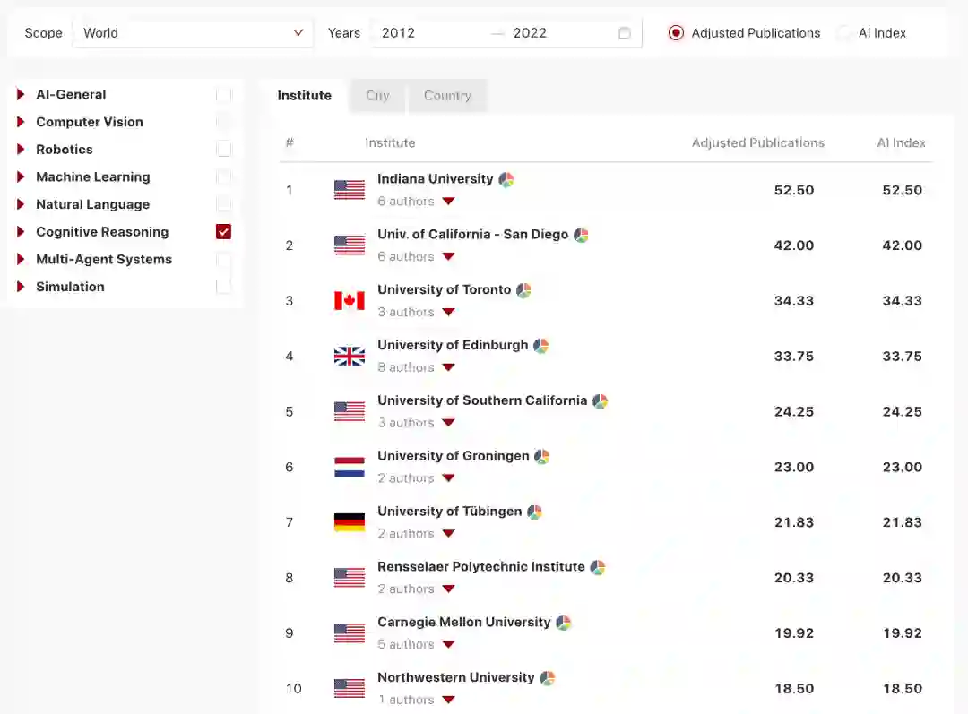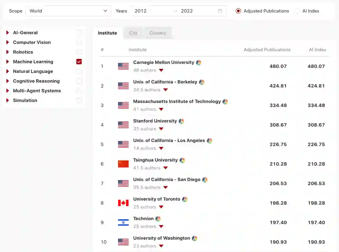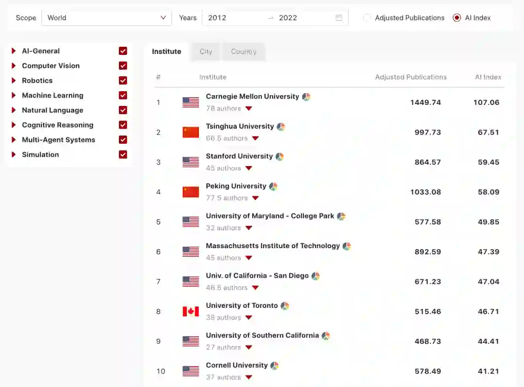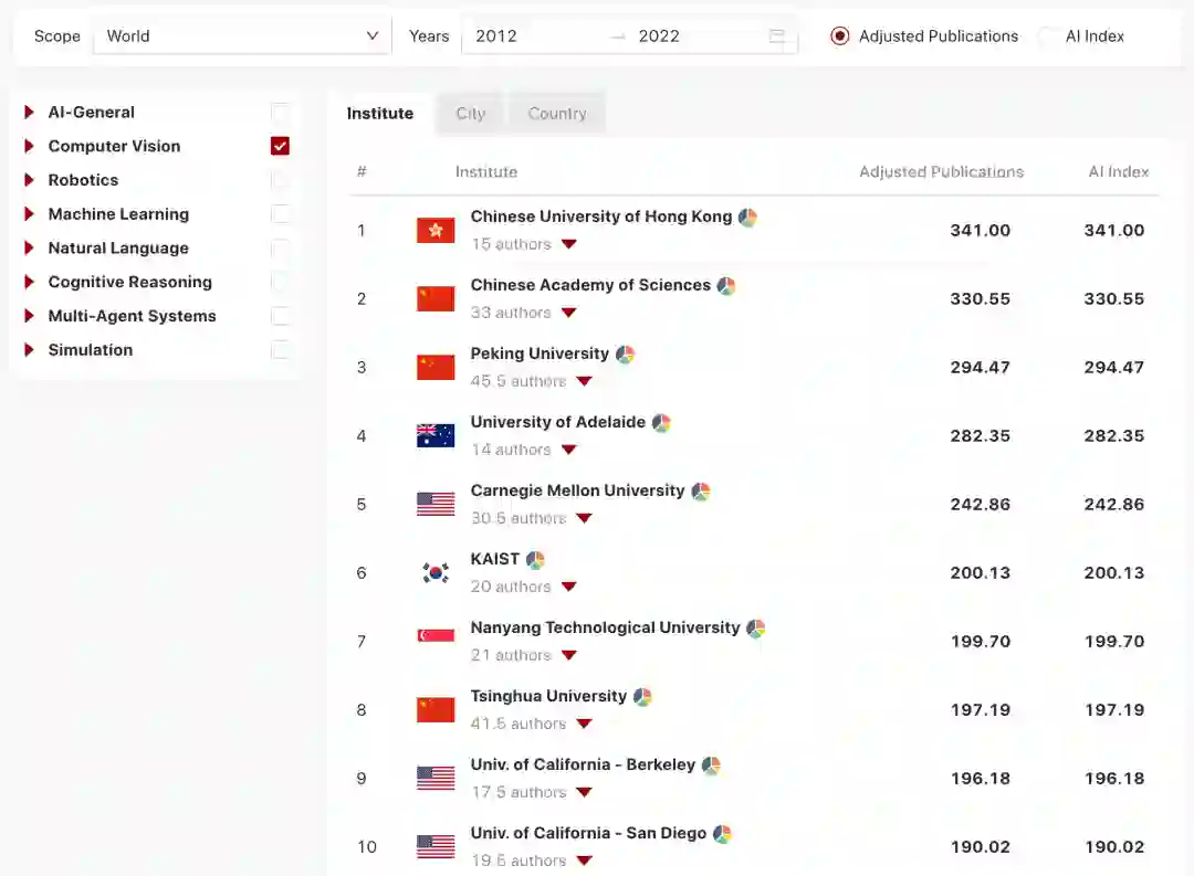 :研究所的Adjusted Publications和AI Index与作者相似,但院校的得分是基于其所有资深作者的出版物。当作者改变隶属关系时,作者的历史分数会随作者一起移动到新的单位。这种设计是假设一个院校的研究水平取决于其当前的人才,而不是建立于其历史成就。