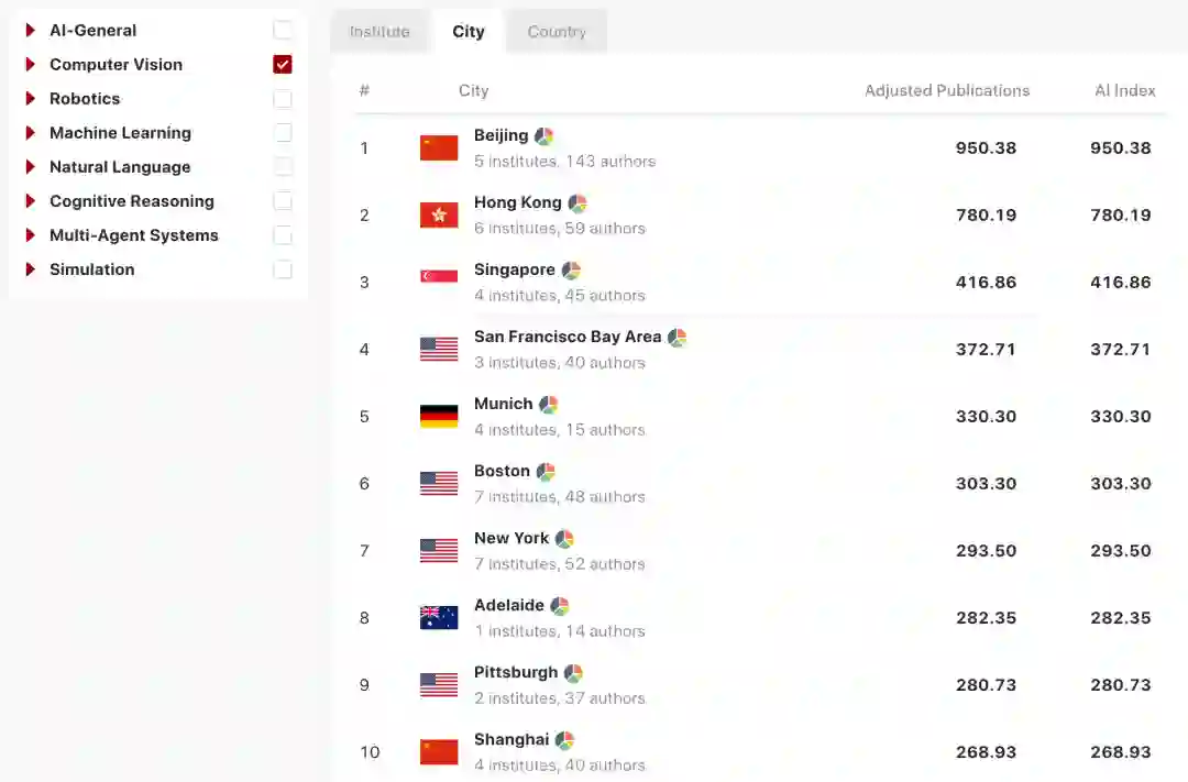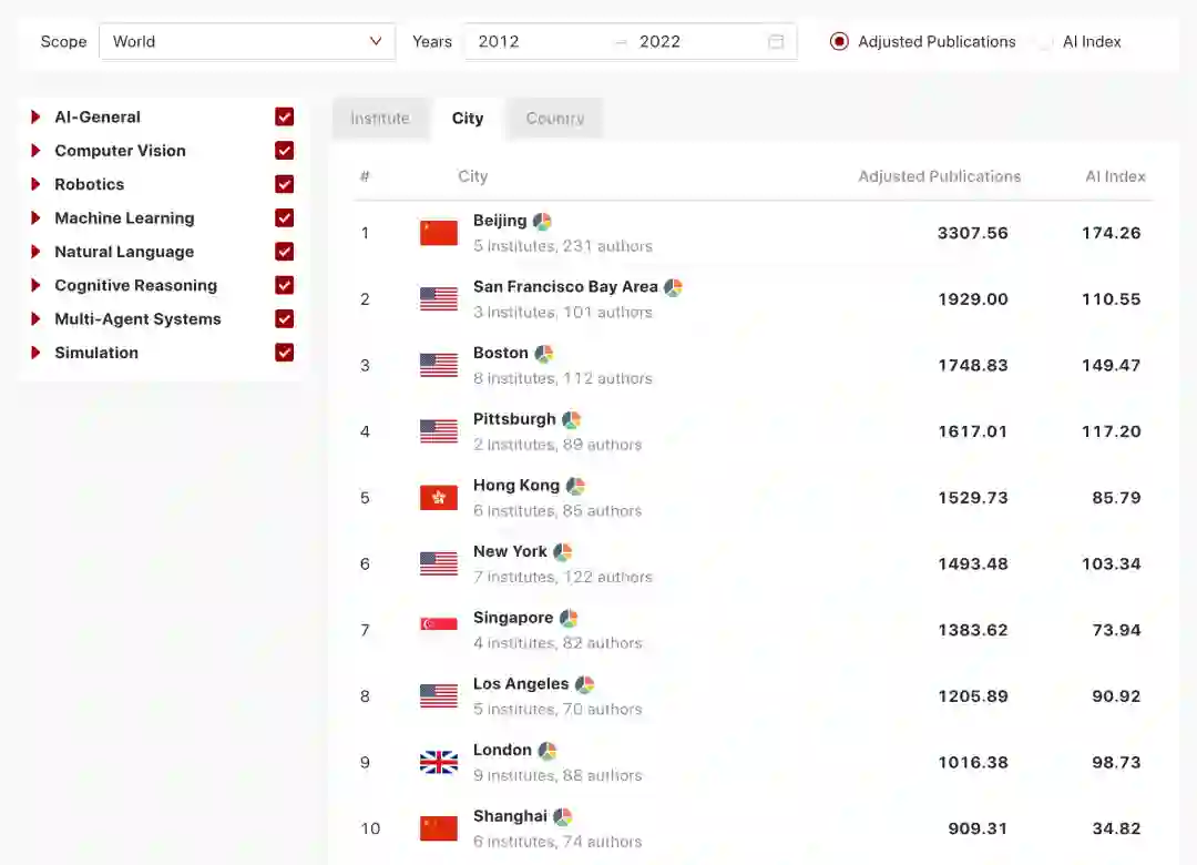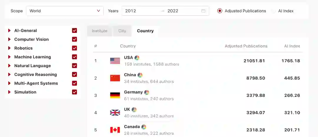 根据AIRankings的报告,在过去十年中,综合通用人工智能、计算机视觉、机器人、机器学习、自然语言、认知推理、多智能体系统与模拟等八个维度的表现,在 AI 研究的出版物方面,全球