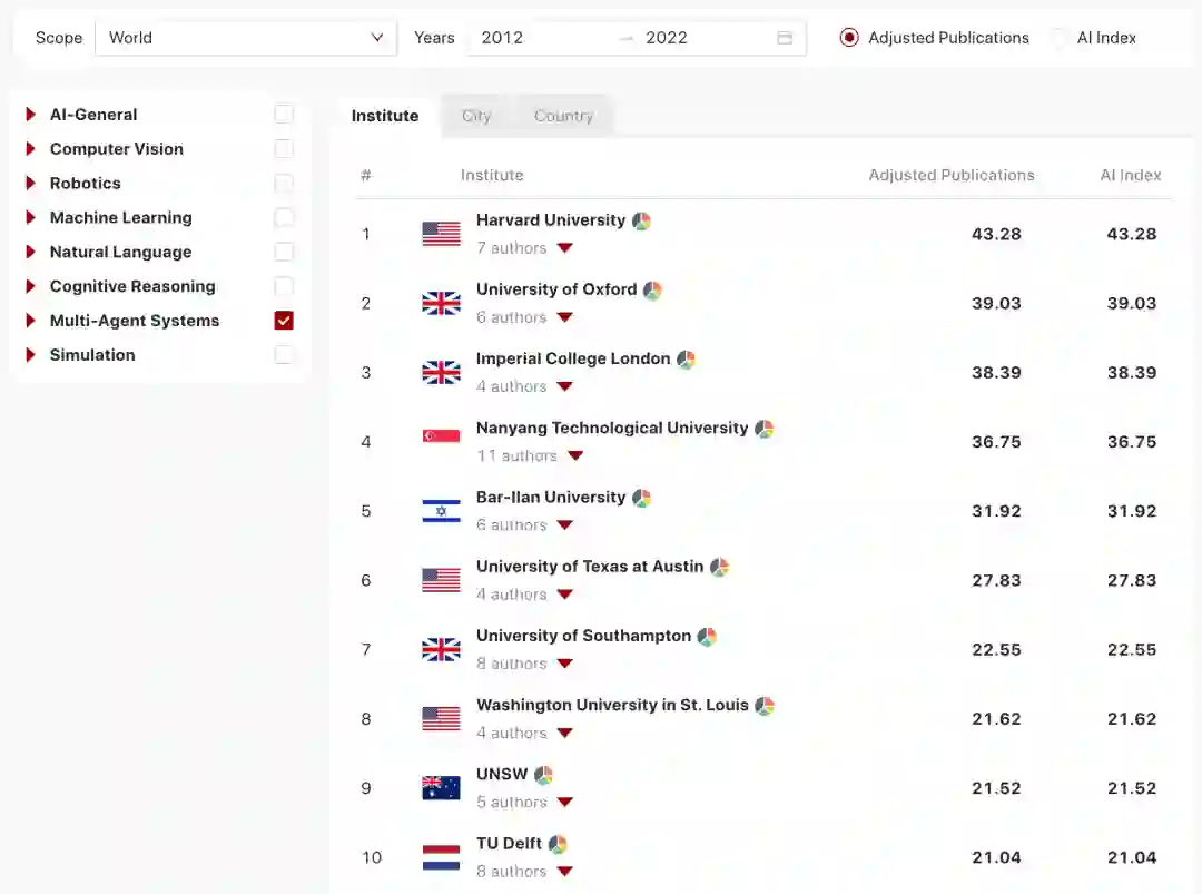 在多智能体系统领域中,TOP3为英美牛校占据。久违的世界强校哈佛大学位列第一,英国牛津大学、伦敦帝国理工学院分列二三。