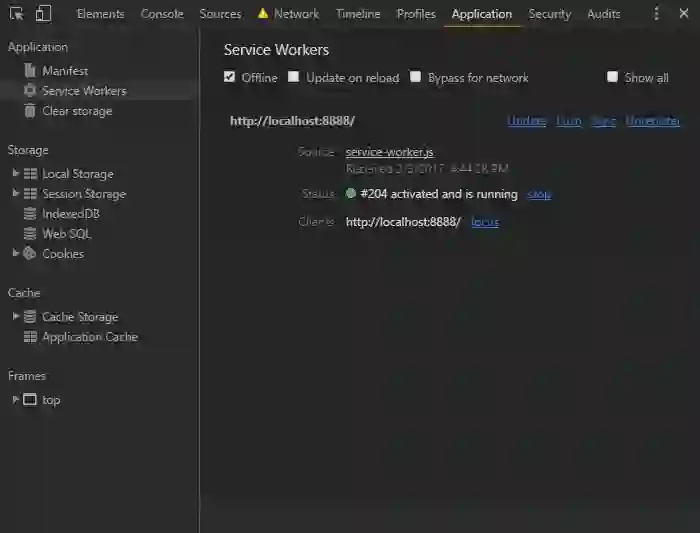如果你认为 JavaScript 调试很苦难的话,service worker 也有趣不到哪里去。Chrome 开发者工具的Application提供了一些有用的特性,日志输出也会打印在控制台上。