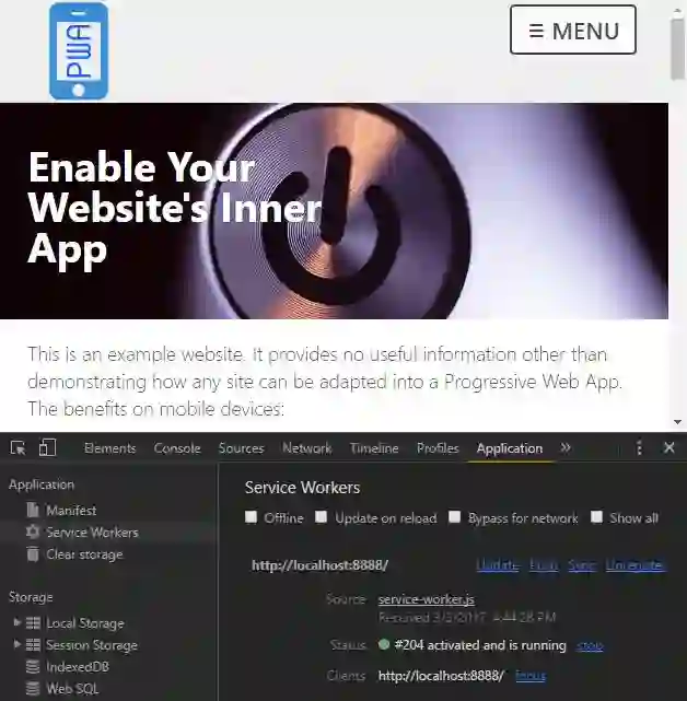 对于上面的阐述来说,HTTPS 并不是必需的,因为 Chrome 允许使用 localhost 和任意的 127.x.x.x 地址进行测试。如果你使用如下的命令行标记启动 Chrome 的话,还可以在 HTTP 站点上测试 PWA: