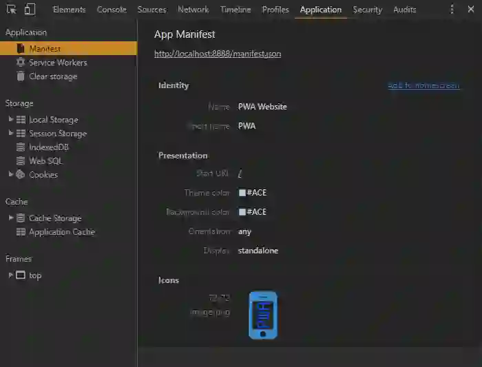 Chrome 开发工具的 Application 标签下 Manifest 区域会校验清单 JSON 并提供一个“Add to homescreen”连接,会将功能放到设备的桌面上: