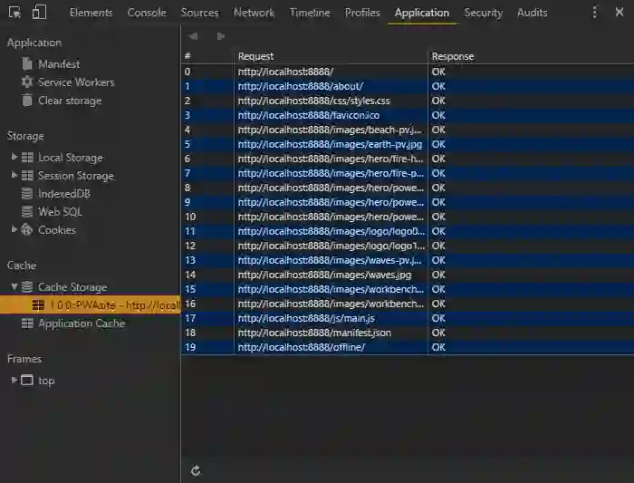 Cache Storage 区列出了当前作用域下所有的缓存以及它们所包含的缓存资产。当缓存更新的时候,你可能需要点击一下刷新按钮。